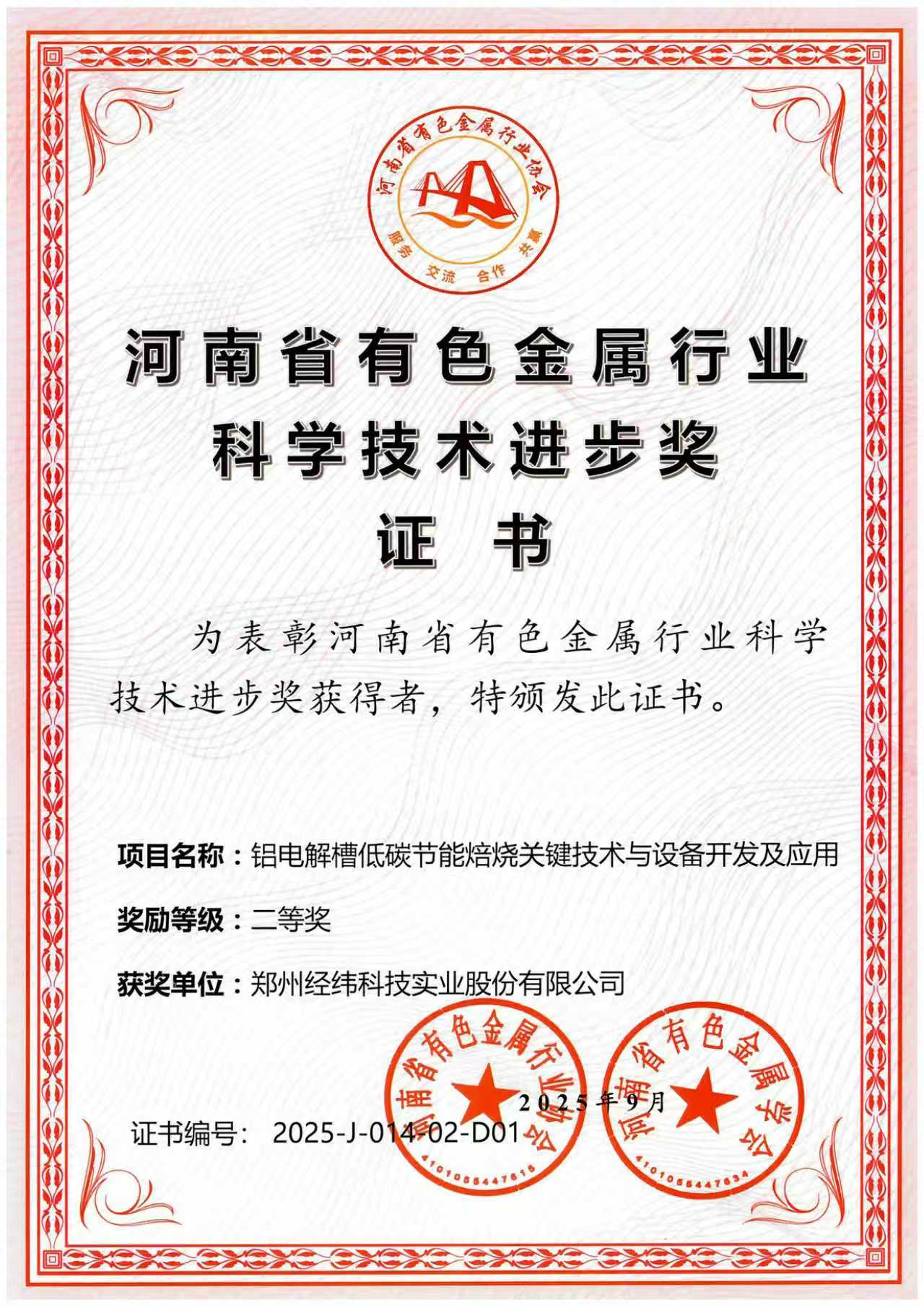 2025年10月14-16日,“第三届中原郑州国际铝工业展览会暨第六届中原国际铝加工创新发展大会”在郑州国际会展中心举行。会议期间,河南省有色金属行业协会对获得省有色行业2025年科技进步奖、优秀专利奖、河南省先进铝基材料产业链科技创新领军人才获得单位及个人进行颁奖。由郑州经纬科技实业股份有限公司(以下简称经纬科技)自主研发的“铝电解槽低碳节能焙烧关键技术与设备开发及应用”项目斩获科学技术进步二等奖,公司副总衡家涛上台领奖。