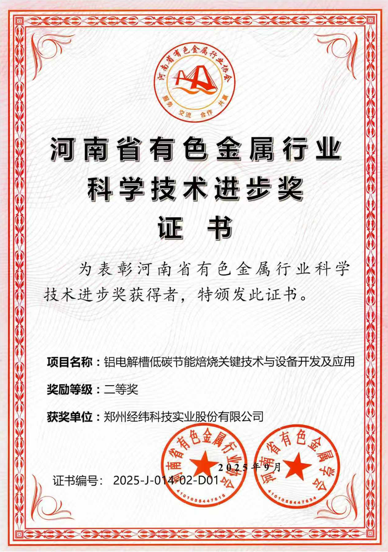 October 14 to 16 , 2025 , the the "3rd Central Plains (Zhengzhou) International Aluminum Industry Exhibition & 6th Central Plains International Aluminum Processing Innovation and Development Conference" were held at the Zhengzhou International Convention and Exhibition Center. During the event, the Henan Nonferrous Metals Industry Association presented awards to organizations and individuals that received the 2025 Provincial Nonferrous Industry Science and Technology Progress Award, the Excellent Patent Award, and the Henan Advanced Aluminum-Based Materials Industry Chain Science and Technology Innovation Leader Award. Zhengzhou Jingwei Technology Industry Co., Ltd. (hereinafter referred to as Jingwei Technology) won the Second Prize of Science and Technology Progress Award for its independently developed project "Development and Application of Key Technologies and Equipment for Low-Carbon and Energy-Saving Roasting of Aluminum Electrolytic Cells". The company's deputy general manager, Heng Jiatao, accepted the award.